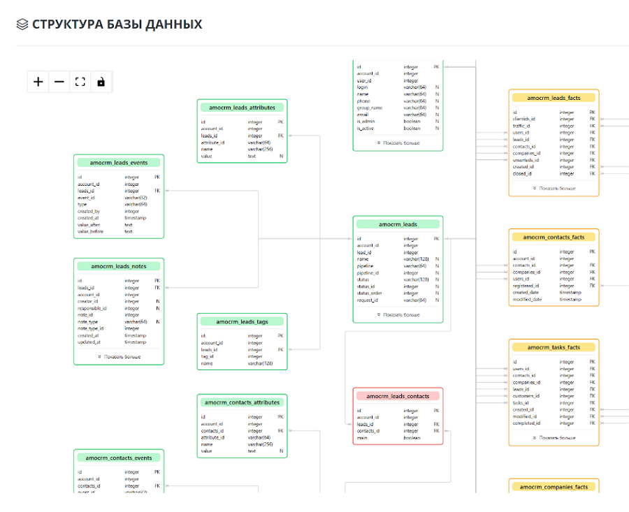 структуры базовой выгрузки данных из API amoCRM: